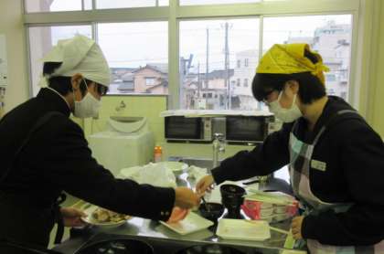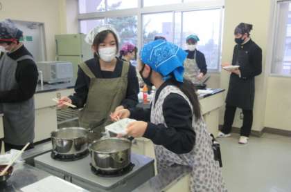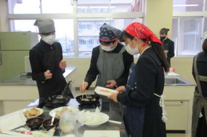 家庭科の時間に調理実習を行いました。班ごとに協力して手際よく調理していました。