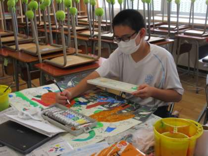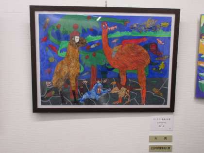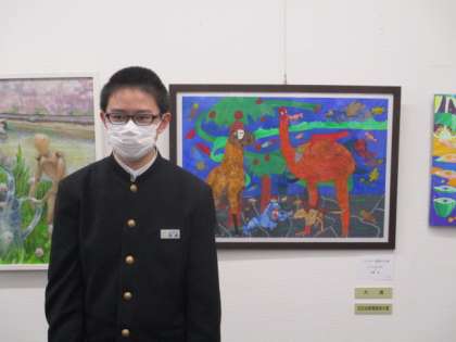 大賞を受賞した渡邉陸さんの作品「モンスター家族の日常」です。1学期から描き始め、夏休みに完成しました。写真は夏休みに制作をしている様子です。