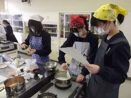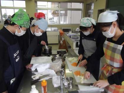 2−2は、今期2回目の調理実習で、ホワイトシチューに挑戦していました。牛乳・小麦粉・コンソメでルーを作るところから始めていました。また、前回よりもグループ内での役割分担が明確になっているようで、手際よく調理が進められていました。出来上がりが楽しみです。