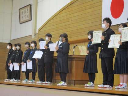 美術作品や作文、科学展覧会への出品や生徒会のかぎかけ防犯コンテスト、科学オリンピックや思考大会等、様々な分野での受賞を報告しました。