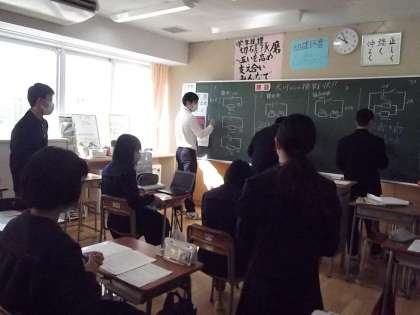 直列回路・並列回路における、回路全体の抵抗(値)を求めようとしています。あちらこちらで学び合いが行われています。「大川先生からの挑戦」という学習課題のため、謎解きのような感覚で、楽しんで学習に臨んでいます。