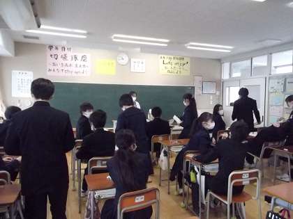 三角形の合同の証明や角度算出の問題に取り組んでいます。短時間でチャレンジし、後列の人が回収していました。