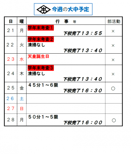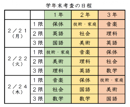 2月21日(月)〜24日(木)は学年末考査です。1年間の振り返りを行い、次年度につなげていきましょう。なお、部活動は25日(金)から再開の予定です。土日の活動については、新型コロナウイルス感染症の感染状況を鑑み、改めてお知らせします。