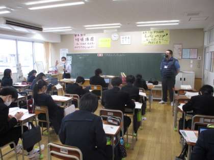 教科書の英文を一緒に読みながら、概要をとらえ、音読したり、質問に答えたりしています。英語を母国語として使っておられるALTの先生との授業の機会は、刺激になりますね。