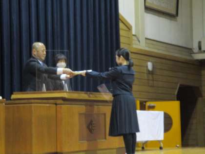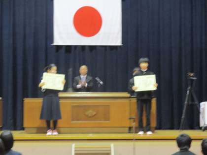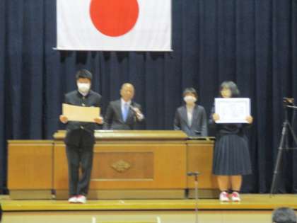 その後、県中学校体育連盟表彰と県中学校文化連盟表彰の授賞伝達があり、それぞれ2名の生徒が表彰されました。