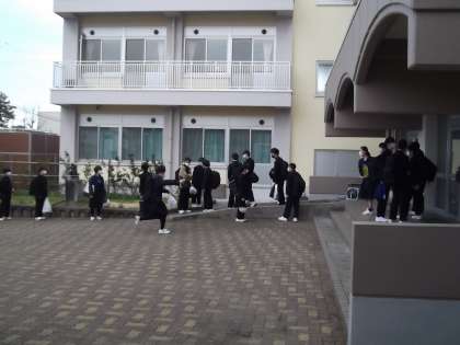 生徒玄関前の様子です。元気いっぱいの大中生が集まっています。久しぶりに友だちと会って、思わず駆け足になる生徒もいます。
