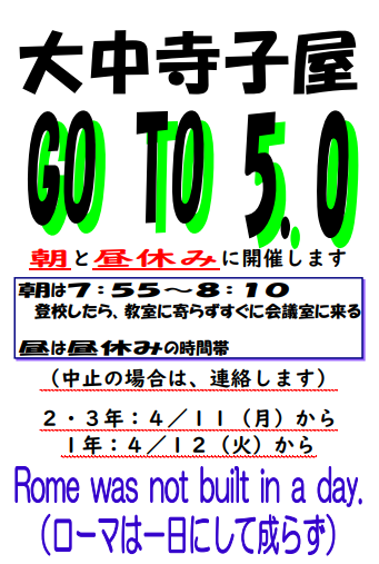 今年度のスタートは、朝の15分間を加えたので、新しく「GO TO 5.0」としました。