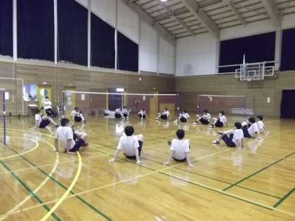 バドミントン部は、練習に入る前のストレッチを行っています。