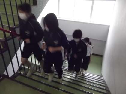 ソフトテニス部は、天候が悪いので屋内の活動に切り替え、内周ランをしています。