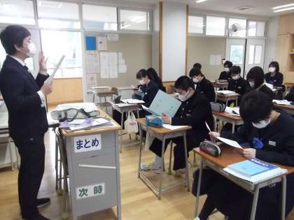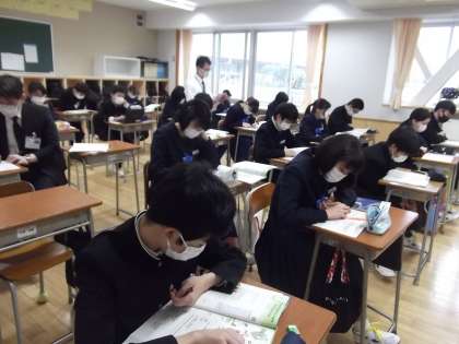 数学の授業についてのオリエンテーションが行われていました。特に、テスト直しノートの意義と作り方、ポイントについて、具体的な説明がありました。みんな真剣に聞いています。