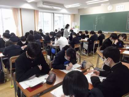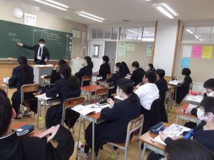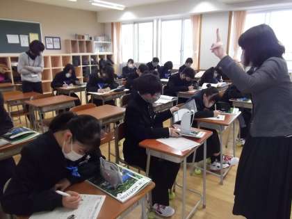「いつ」の表し方について学習しています。西暦やBC・ADなどについて、由来を含め説明されています。CHRISTと英語で書かれていたにもかかわらず、すぐに「キリスト」と反応した生徒がとても多く、頼成先生もビックリしていました。