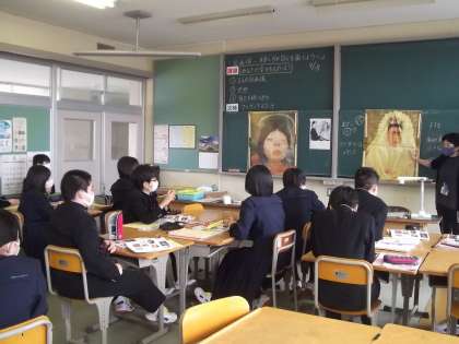 自画像に取り組みます。今日は、特徴ある自画像の説明がありました。ただ正確に描画するのではなく、思いや願い等を盛り込んで、自分らしい個性あふれる自画像に仕上げてほしいです。