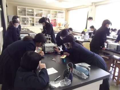 塩化銅水溶液に電圧をかけて、電流を流しています。「すごく泡が出てきた」「プールに行き過ぎたにおいがする」など、ユニークな反応を見せていました。実験を楽しんで、集中して取り組んでいるという証拠ですね。