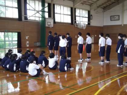 集団行動に取り組んでいます。今日は、グループ別に学びの成果を発表しました。指揮者の指示に従って、向きを変えたり行進したりしました。なかなか上手です。来月には体育大会もあるので、そこで保護者や地域の方にも成長した姿を披露してください。
