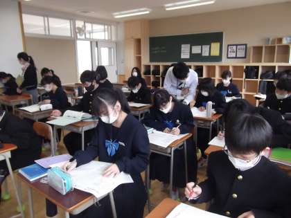 富山市中1学力調査の答案が返却されました。まずは、○×の判定に間違いが無いか、正答例をもとに確認しています。ティームティーチングにより、きめ細やかに机間指導が行われています。