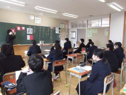 「名前の漢字を紹介しよう」という課題で学習に取り組んでいます。「彩美」先生なので「彩」が例に挙げられています。漢字の部首についての発問では、生徒の多くが反応し意見を述べていました。