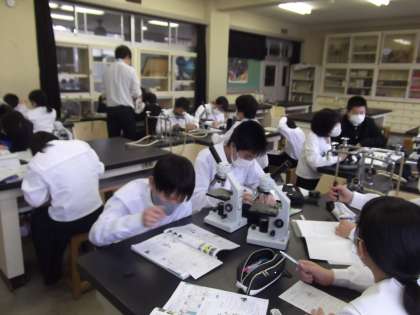 理科室で、顕微鏡の使い方について学習しています。まずは操作前に、プリントを使って留意事項の確認です。