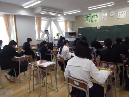 まずは「読む」ことからです。今日学習する「make+代名詞+形容詞」について身に付けようと、全員で音読しています。