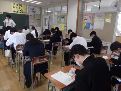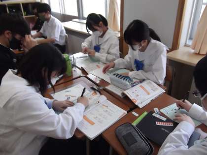 電解質水溶液に関する実験を終え、確認のためのミニテストに取り組んでいます。細かな評価材料の積み重ねが、学期毎の評価へとつながります。