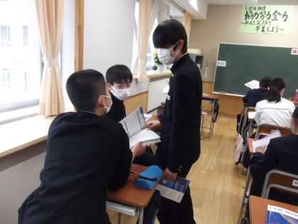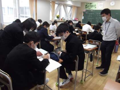 3年生は、主体的な学びが定着しています。3−1では、ワークブックの中の問題を基に学び合っている姿がありました。3−2では、数学の乗法公式の展開について、T2の谷口先生に質問しながら学習を深めていました。