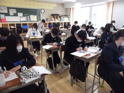 今日の寺子屋には、20人程の大中生が参加し、自主学習に励みました。漢字・計算等、常備してあるプリントについては担当者が○付けやアドバイスをしていますが、列ができるくらい大盛況でした。