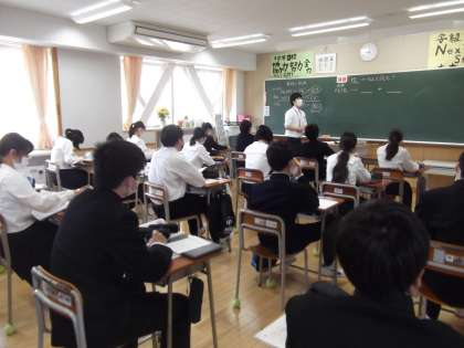 中和反応について学習しています。電離の様子をイオン式を用いて表すことで、目に見えない世界を可視化し思考を深めています。この後、中和反応の演示実験をみることになっています。