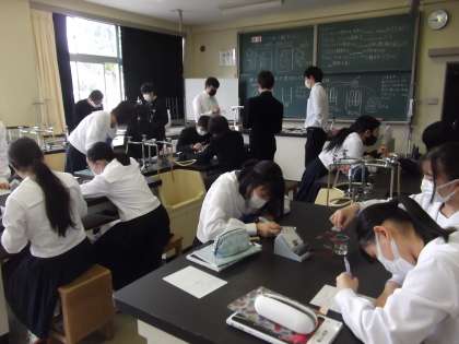 2種類の金属と電解質水溶液で電流が流れるか、実験しています。電流が流れたかどうかについては、電子オルゴールが鳴ったかどうかや、電圧計を用いたりして判断しています。班内で自然と役割分担され、スムーズに実験が行われています。さすが3年生です。