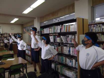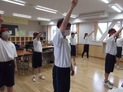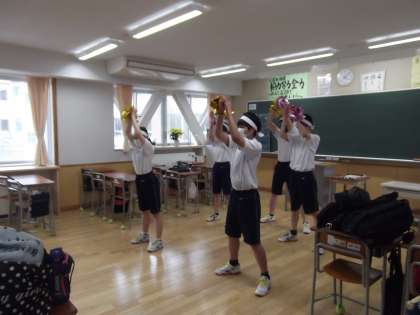 各団のリーダーが、集団演技の練習を行っています。選曲・振り付けとも、個性あふれるものになっています。来週から、団活動で指導する立場になるため、振り付けを確実に覚えようとがんばっています。みんなとても素敵な表情です。
