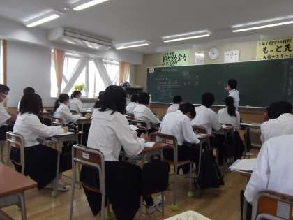 1−2では、社会で半球についての学習が行われています。地球における海と陸の面精機から、その割合を求めていますが、みんな興味深そうに授業に臨んでいます。(写真中)