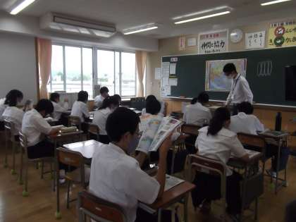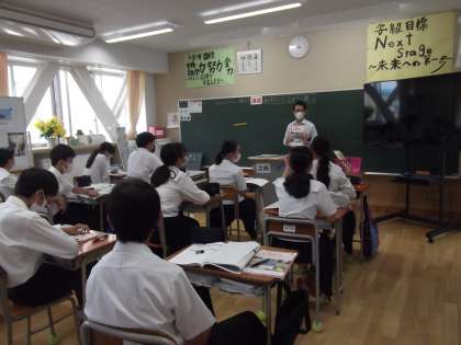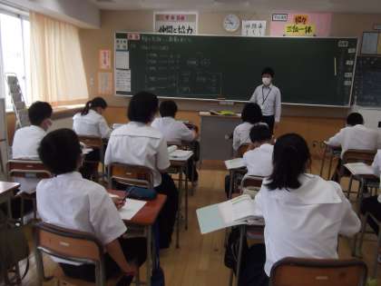 1−1は社会(写真上)を、1−2は数学(写真中)を、3−2は英語(写真下)を学習しています。一斉授業のスタイルですが、大中生の体は先生の方を向いており、言葉のキャッチボールもあります。みんな意欲的に授業に参加しています。
