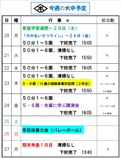 また、生徒会執行部企画の挨拶運動「大中あいさつライン」が始まります。活気ある大中をみんなで創りましょう。