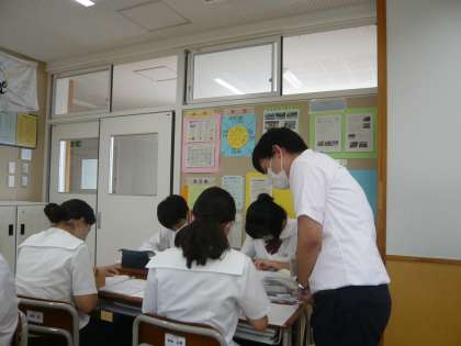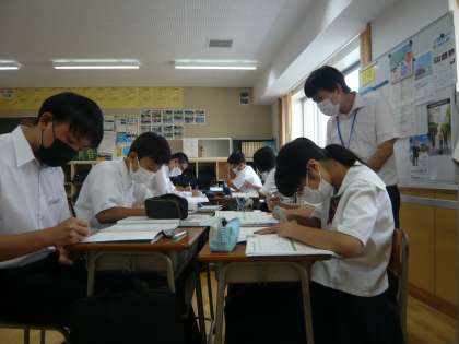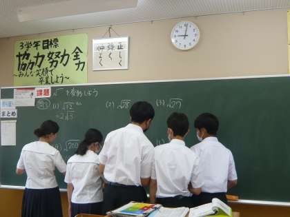3年2組の数学では、根号のついた数の変形について、グループ学習を通して学んでいます。発表にも積極的に取り組んでいます。