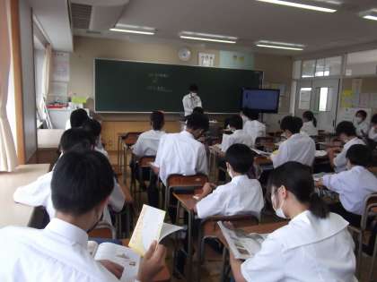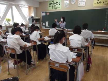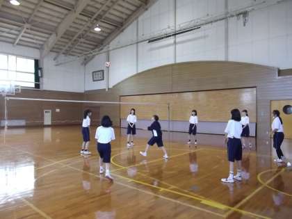 1−1は体育で、バレーボールの円陣パスに取り組んでいます。なかなか思うようにボールがつながらない場面が多いですが、どの生徒も顔晴っています。(写真上)