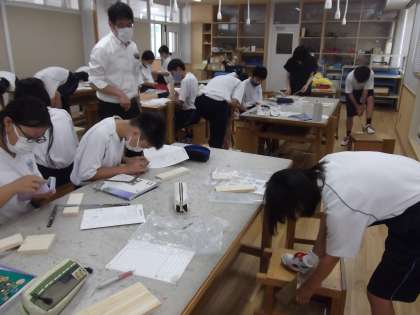 1−1は技術で、木材加工の実習を行っています。けがきを終えた生徒から、のこぎりを使って材料を切ります。どの生徒も楽しそうに、かつ真剣に取り組んでいます。(写真上)