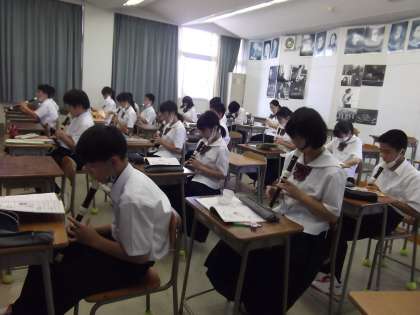 1−2は音楽で、アルトリコーダーの練習をしています。ド〜ソの運指に慣れることが課題で、意欲的に何度も何度も同じ音階を練習する姿が印象的でした。(写真中)