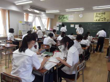 3−2は理科で、期末テストの範囲の自主学習の時間でした。個人やグループなど、取り組み方は自由ですが、3年生らしくどの生徒もめあてをもって取り組んでいました。(写真下)