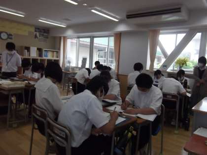 そんな中、多くの大中生が朝の寺子屋に集まり、自主学習に励みました。15分という短い時間を大切にする姿勢が、少しずつですが身に付き始めた感じがします。(写真上)