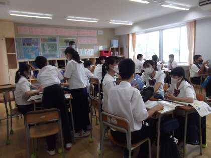 1−2は社会で、大泉中学校の地球の裏側はどこか、地球儀を使って推察していました。みんなで話し合いながら、課題に楽しく取り組んでいました。(写真上)