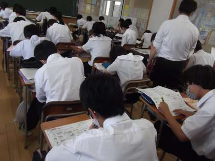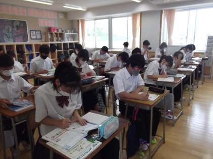 1−1、2−1はそれぞれ、期末考査の範囲の、学習の振り返りをしていました。みんなとても真剣に取り組んでいました。(写真中:1−1英語  写真下:2−1理科)
