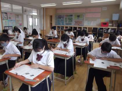 1年生にとって、中学校生活初めての定期考査になります。3日間にわたり、全9教科に臨みます。(写真中・下)