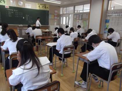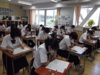3年生の、期末考査に向かう姿です。教室内は、集中度の高い緊張感のある空気感です。試験に向かう姿勢に、「さすが3年生」という風格が出てきました。(写真中・下)