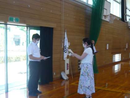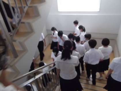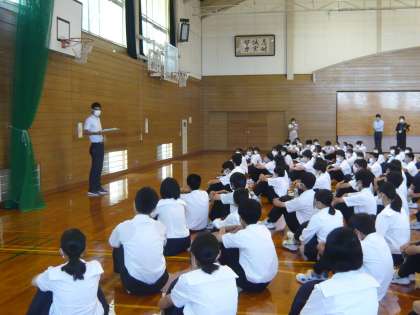 今日の3限目で、1学期末考査が終了しました。その後、今年度2回目の避難訓練を実施しました。火事を想定した訓練で、本来ならグラウンドに避難でしたが、気温がとても高く日射量も多かったので、熱中症回避のため体育館への避難としました。生徒はみんなとても真剣に取り組みました。訓練後、担当者が講評し、避難訓練の意義について再確認しました。