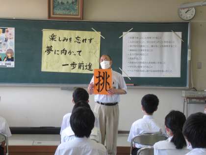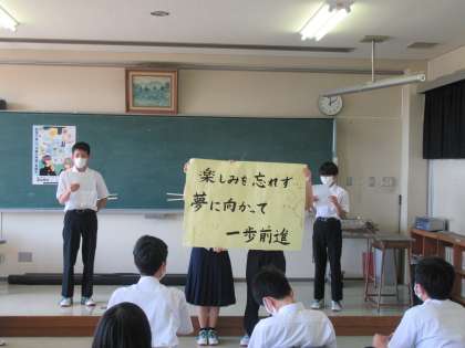 出発式では、まず、スローガンの確認がありました。次に校長先生から「分からないことがあったら何回でも聞いて、自分の意思で動くことが大切」との激励の言葉がありました。生徒は真剣な眼差しで話を聞き、来週からの挑戦に意欲を高めていました。