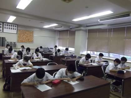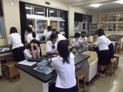 1−1の理科では、メスシリンダーを使って物体の体積を測定していました。1円玉・10円玉という身近な硬貨を使っているので、生徒の意欲も一層高まっている感じです。(写真下)
