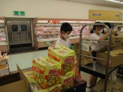 カッターを用いて、多くの商品の中から、特定の商品を箱から出し、出した商品を棚へと運び、綺麗に並べていました。