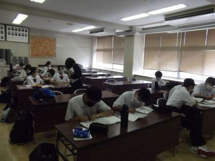 昨日に引き続き、今日も10名以上の3年生が寺子屋に集まり、自主学習に励みました。理科で、2年生で学習する「化学反応式」でつまづきが見られる生徒がいたので、問題を出して参加者全員で考える時間を作ってみました。このことで、つまづきの要因の一つがクリアになったようでした。