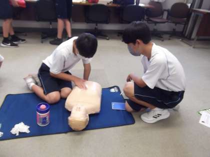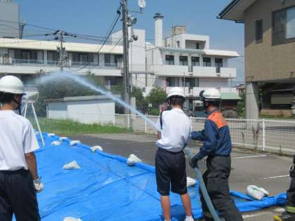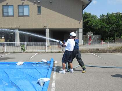 「富山消防署」では、心肺蘇生法の講習を受けた後、放水作業を体験させていただきました。ホースは見た目以上に重く、準備をするのに苦戦した様子でしたが、暑い中一生懸命取り組んでいました。