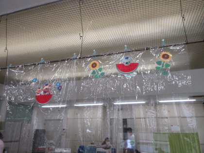 上:生徒2人が装飾したビニールカーテンが窓口に掛かっていました。日本郵便のキャラクター「ぽすくま君」とスイカのイラストが涼しげです。