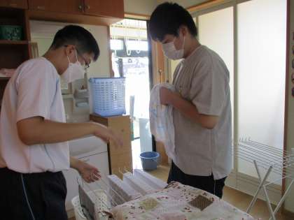洗濯物を取り込んで、たたむ作業をしていました。その後、利用者さんたちにお茶を運んでいました。