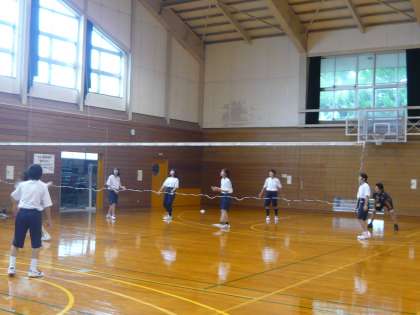 1年保健体育「バレーボール」互いに声を掛け合いながらプレーしています。(写真・下)